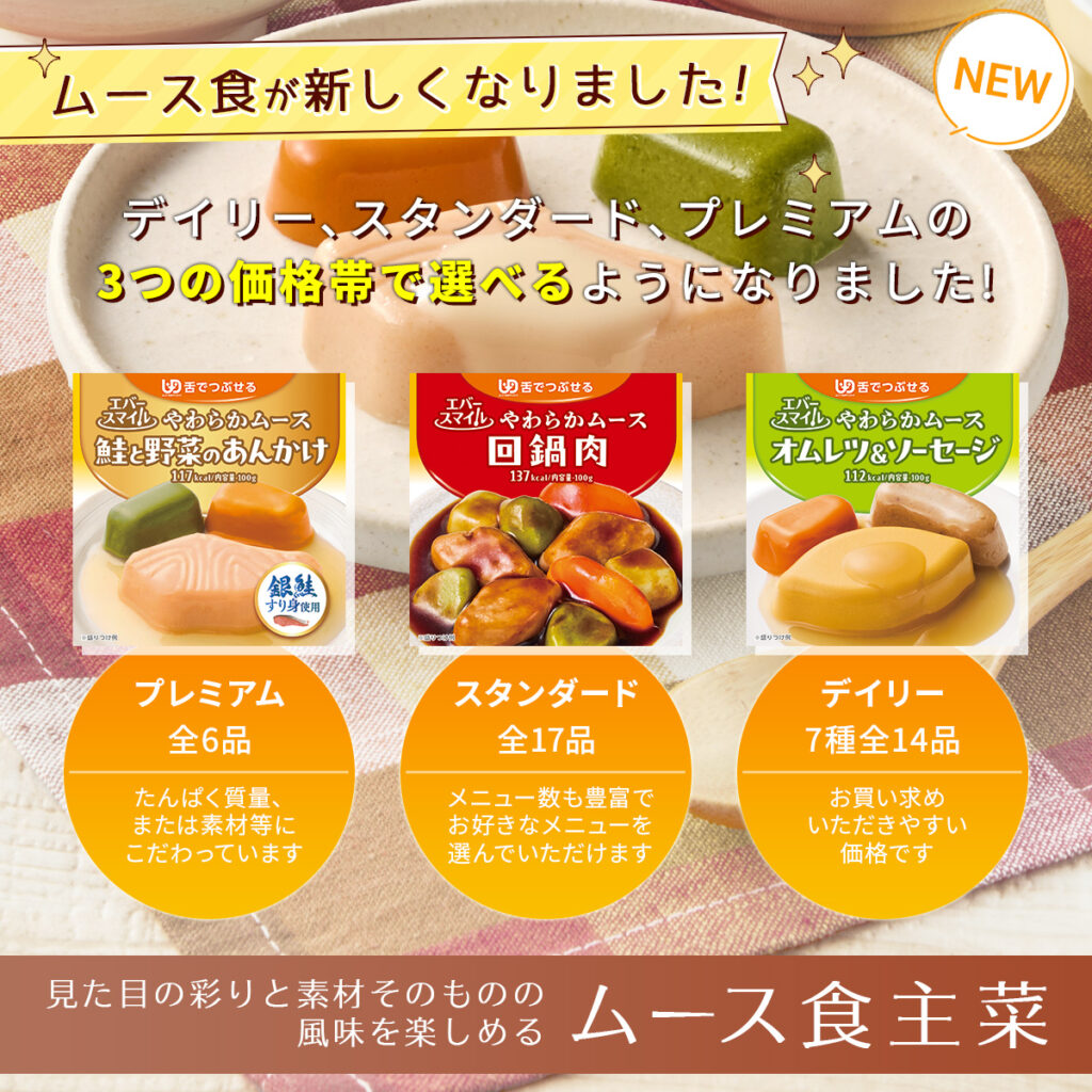 平素よりエバースマイルをご愛顧いただき、誠にありがとうございます。このたび、「エバースマイル ムース食主菜(おかずシリーズ)」が2026年4月1日より全面リニューアルいたします。詳細は下記をご確認ください。なお、リニューアルに伴い、現行品の一部商品が品切れ状態となり、お客様に多大なるご迷惑をお掛けしましたことを深くお詫び申し上げます。